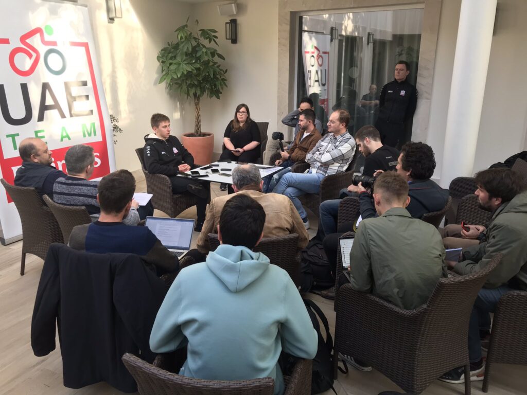 Fue de los últimos en llegar a la comida después de otro largo entrenamiento en los alrededores de La Nucia, al lado de Benidorm, en la provinci de Alicante. Kilómetros y más kilómetros de base supervisados por su entrenador Iñigo San Millán y coordinados por Joxean «Matxin» Fernández, en su nuevo rol de mánager deportivo. Apareció en la sala con chándal del equipo arábigo y chanclas negras, capucha tocada a modo de rapero o caballero jedi, para quitársela, medio despinado, sonriente y con cierta faz de somnolencia en plena hora de siesta española. No fue óbice para su conferencia de prensa sin estrés, como el que reconoce que nunca tiene.