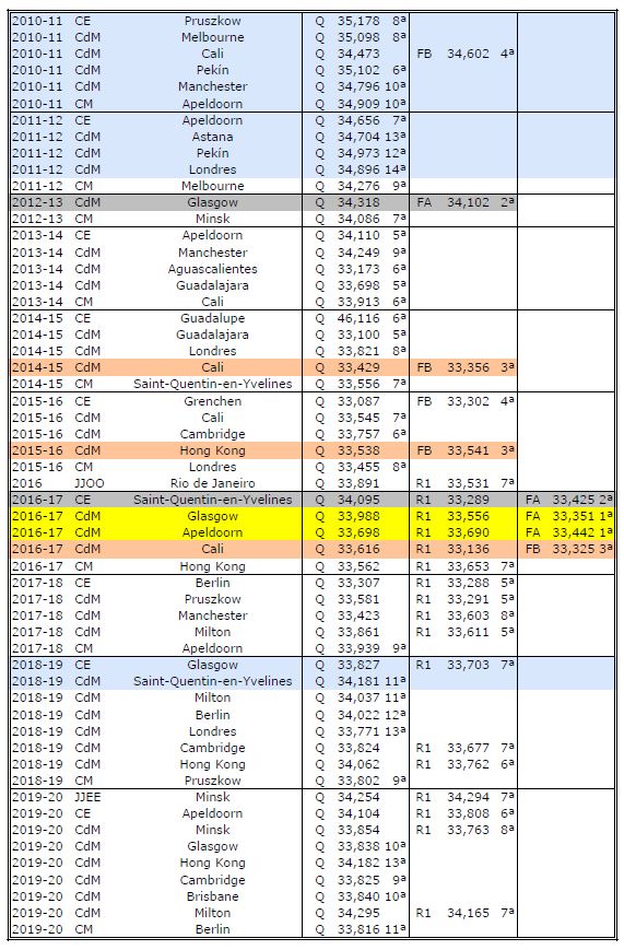 Los resultados de la pareja española: en amarillo, medallas de oro; en gris, las de plata, y en marrón, las de bronce © Track Piste