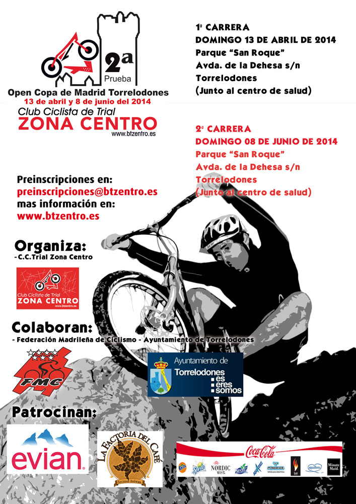 El trial del domingo tendrá lugar en el Parque San Roque (Avenido de la Dehesa s/n), junto al Centro de Salud en Torrelodones. La apertura de inscripciones se realizará a las 9h. Para inscribirse en dicha competición se podrá hacer hasta las 22:00h del sábado anterior a la carrera y se tendrá que realizar un ingreso de 10€ a este número de cuenta (IBAN 2100 0460 4602 00067427) además de mandar un email a preinscripciones@btzentro.es indicando el nombre y apellidos, número de licencia, Comunidad Autónoma y fecha nacimiento.