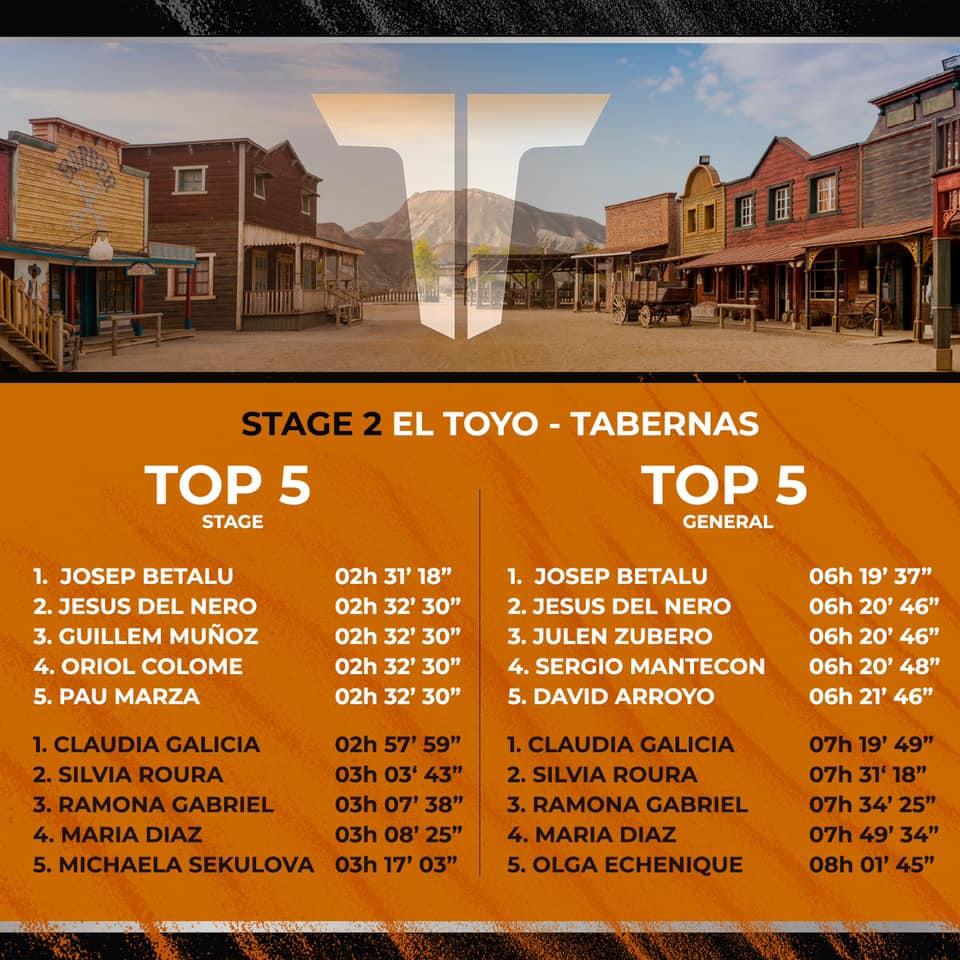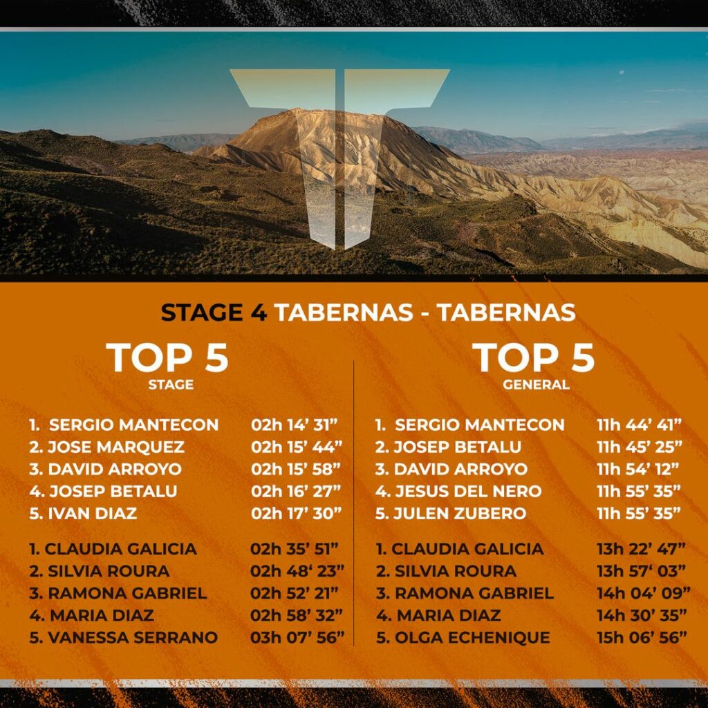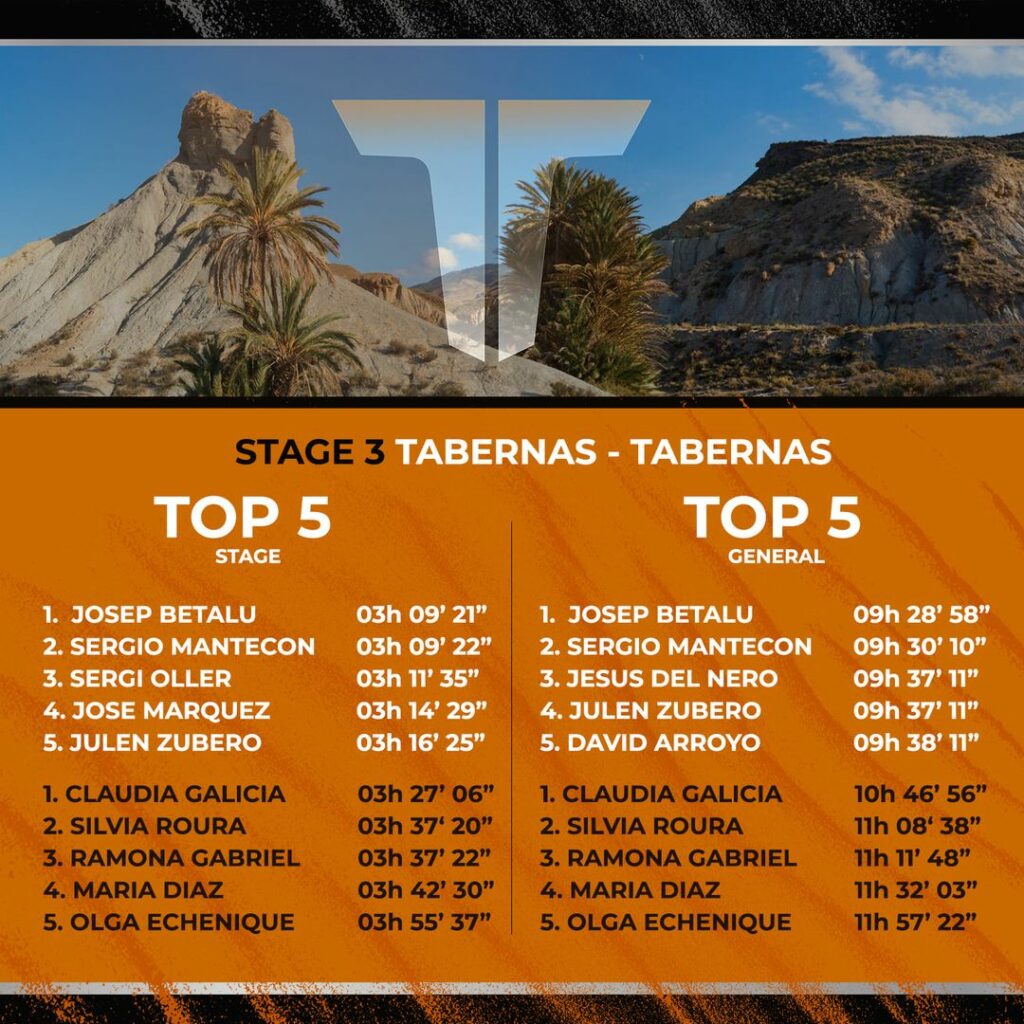 La tercera etapa circular constó de 93 km y 1.633 m de desnivel positivo en pleno corazón del desierto de Tabernas. Josep Betalú y Sergio Mantecón levantaron polvo a su paso y lanzaron un ataque fulminante para rebasar al resto de competidores en los últimos kilómetros. El tetracampeón de la Titan Desert sacó fuerzas de flaqueza y consiguió imponerse en la meta por delante de Mantecón con un tiempo de 3h09’21’’. Al igual que su homólogo masculino, Clàudia Galicia volvió a mostrarse intratable y terminó en 30ª posición de todas las categorías unidas, con 3h27’06’’ en el crono.