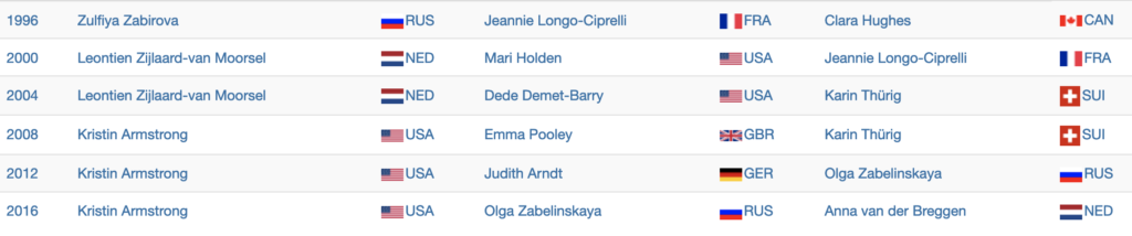 Van Vleuten, que tres días antes ganó la medalla de plata en la carrera de ruta femenina, superó a la suiza Marlen Reusser (31:09.96) y a su compatriota Anna Van der Breggen (31:15.12), quienes completaron el podio. Van der Breggen repite el bronce que ya consiguió en la contrarreloj de Río 2016. Mavi García, única española, terminó antepenúltima a 4:26 de la neerlandesa.