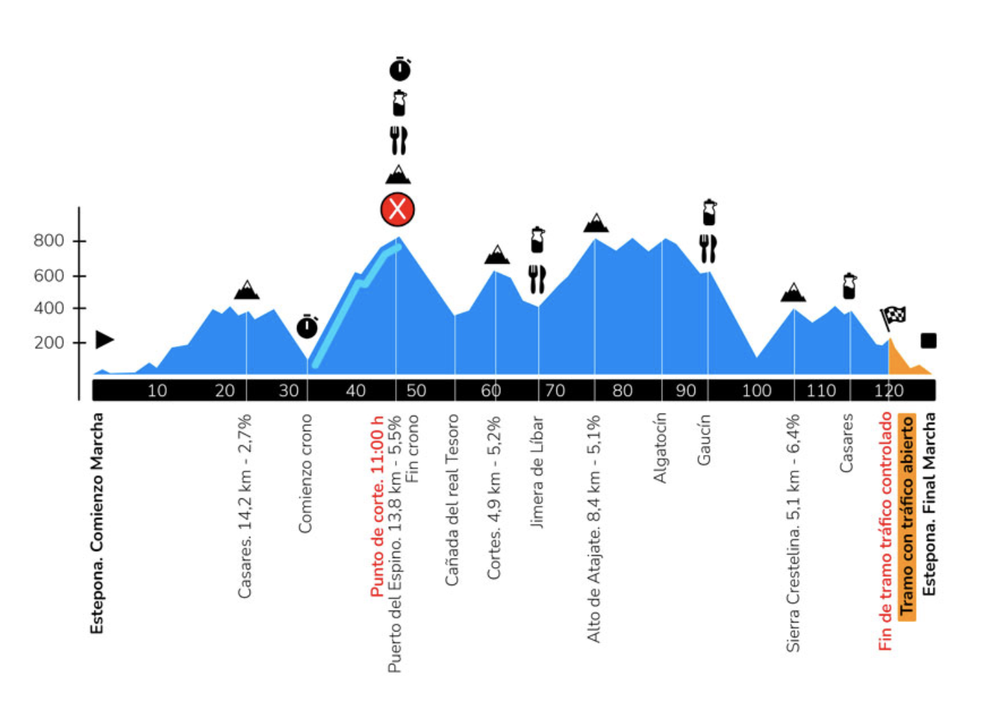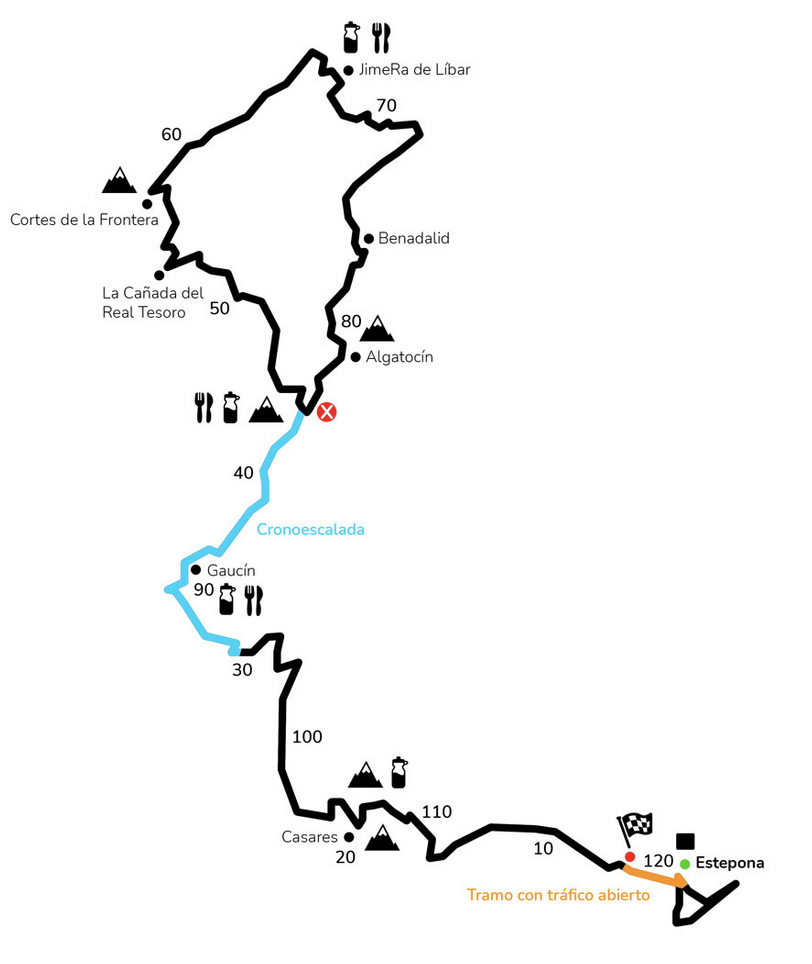 La Serranía de Ronda, con sus valles, ríos y pinares, y los pueblos blancos que en ella se asientan, como Casares, Jubrique, Algatocín o Gaucín, volverán a ser testigos de una nueva edición de la marcha y del esfuerzo de los corredores, que deberán superar cinco altos de montaña hasta acumular los 3.500 m de desnivel positivo y llegar a la meta, localizada igualmente en el recinto ferial de la localidad: Casares, sobre el kilómetro 20 de la marcha, el Puerto del Espino en el 46, el alto de Cortes de la Frontera en el 60, el alto de Atajate en el 81 y, para finalizar, el plato fuerte de la jornada, el Puerto de Peñas Blancas, una ascensión de cerca de 24 kilómetros de longitud y una pendiente media del 3,1%, aunque en algunos tramos se llega a superar el 14%, cuya cima se encuentra sobre el kilómetro 112 y sobre el que se desarrollará una cronoescalada en la que los participantes podrán poner a prueba sus dotes de escalada. Un puerto que también será protagonista en la Vuelta a España, y que al igual que hiciera en el año 2013, volverá a ser final de etapa.