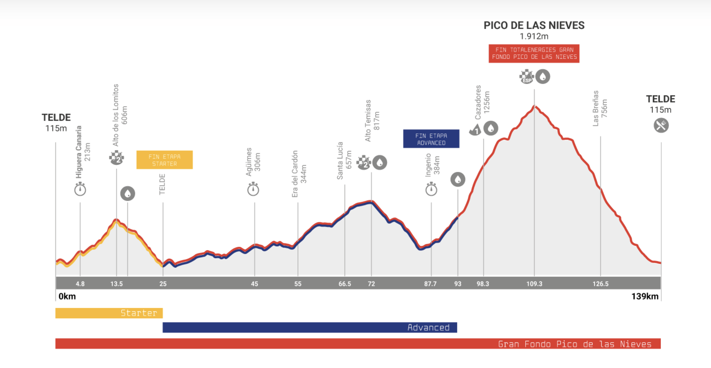 Además de la prueba reina, la Categoría Advanced contará con una distancia total de 88 kilómetros, un desnivel total de 1.600 metros y una altitud máxima de 817 metros en el Alto de Temisas. Por otro lado, para los inscritos en la Categoría Starter, se rodará una distancia total de 25,4 kilómetros, con un desnivel total de 600 metros con una altura máxima de 606 metros en el Alto de los Lomitos. La TotalEnergies Gran Fondo Pico de las Nieves, además, será la primera cita de la Gran Canaria Bike Week, que se llevará a cabo del 1 al 8 de diciembre y que pondrá a Gran Canaria, una vez más, como uno de los mejores destinos existentes para rodar en bicicleta.