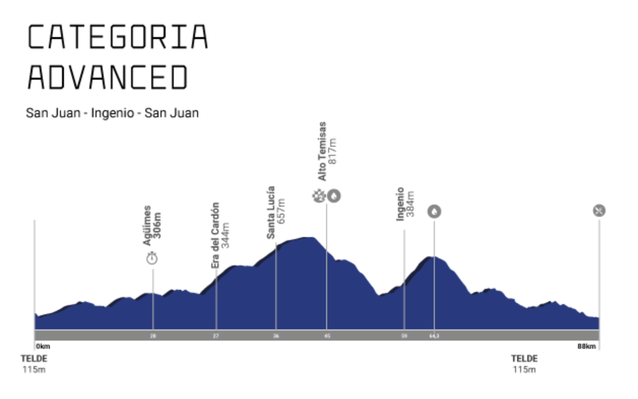 La Categoría Gran Fondo contará con una distancia de 138 km, 3.522 m de desnivel positivo total y altitud máxima de 1.906. La salida, un año más, será en la Plaza San Juan de Telde y contará con tres tramos cronometrados. El primero se encontrará entre La Higuera Canaria y Alto Los Lomitos; el segundo tramo en el Alto de Temisas; y el tercero y último estará centrado en el genuino Pico de las Nieves, uno de los puertos más duros de Europa.