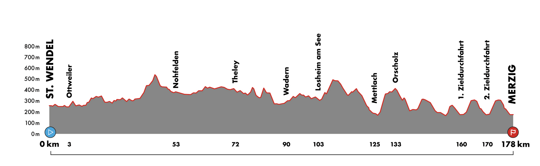 La 1ª etapa también sale de St. Wendel. La jornada, que transcurre íntegramente en el Sarre, conduce a Merzig a lo largo de 178 kilómetros. Los primeros kilómetros discurren inicialmente hacia el sur, hasta que antes de Neunkirchen se produce un cambio de dirección y los profesionales recorren la frontera estatal hacia el norte. Ya al principio de la etapa, se sube el punto más alto del día, cerca de Freisen. Un constante sube y baja, en parte con rampas muy empinadas, caracteriza la parte media de la etapa. Pasado el Bostalsee se pasa por Wadern, Weiskirchen de camino al bucle del Saar cerca de Mettlach. Para el final en Merzig, espera una difícil vuelta final con la subida a la Capilla de Kreuzberg, que algunos corredores ya conocen de 2018, y que debe conquistarse dos veces. En aquella ocasión, el posterior ganador de la general Matej Mohoric pudo imponerse a Nils Politt. Un vistazo al perfil revela que será un día para los especialistas en clásicas.