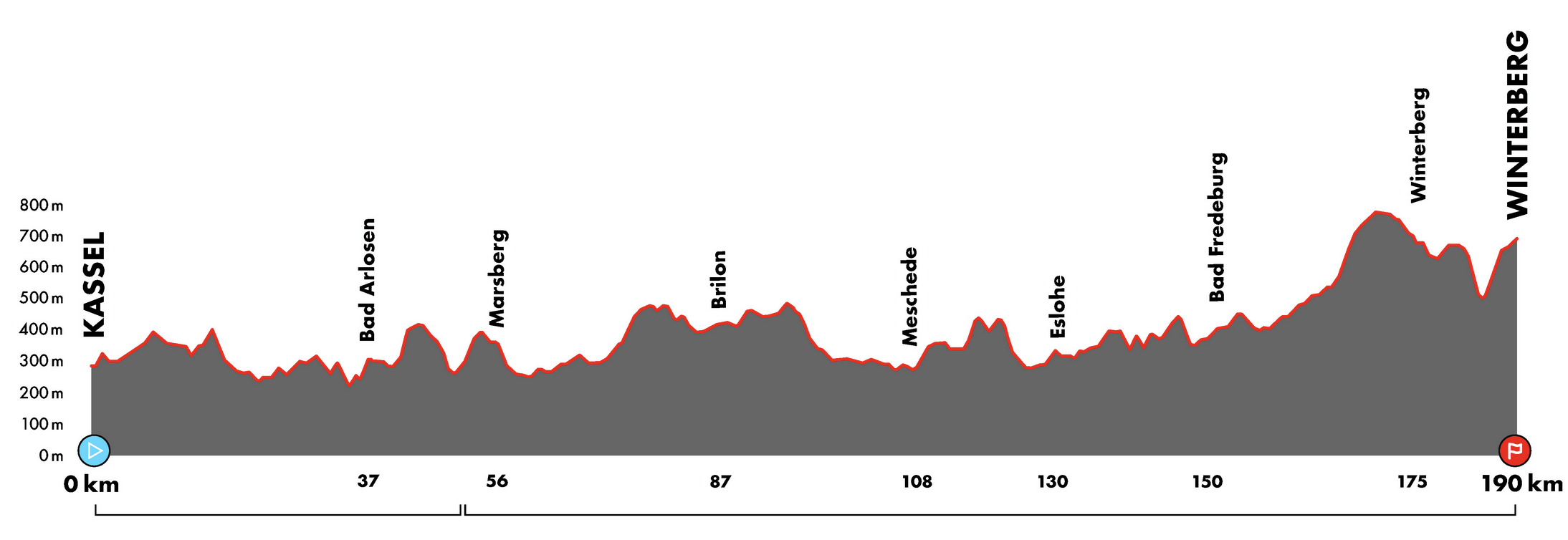 Para la 2ª etapa, los profesionales saldrán de Hesse. La etapa más larga de la carrera de este año comienza en el centro de Kassel y termina tras 190 kilómetros en Winterberg. La salida real tiene lugar frente al edificio Marstall de Schloss Wilhelmshöhe. Antes de pasar la frontera estatal, Hesse se despide con una corta subida empinada por detrás de Bad Arolsen, camino del distrito de Hochsauerland. El terreno sigue siendo típico de Sauerland y la ruta ondulada conduce a través de Marsberg, Brilon y Meschede al lago Hennesee y a Eslohe. Las piernas de escalador deben estar en plena forma a más tardar a última hora del día. En Altastenberg se alcanza el punto más alto del Deutschland Tour de este año. Winterberg está a la vista, pero aún quedan 20 kilómetros hasta la línea de meta. La vuelta de meta conduce de nuevo fuera de Winterberg y, tras un corto y empinado descenso hacia el valle de Orketal, pasado el Wintersport Arena Sauerland, comienza la contraescalada decisiva. 2,5 kilómetros de subida por la Hochsauerland Höhenstraße hasta el último kilómetro.