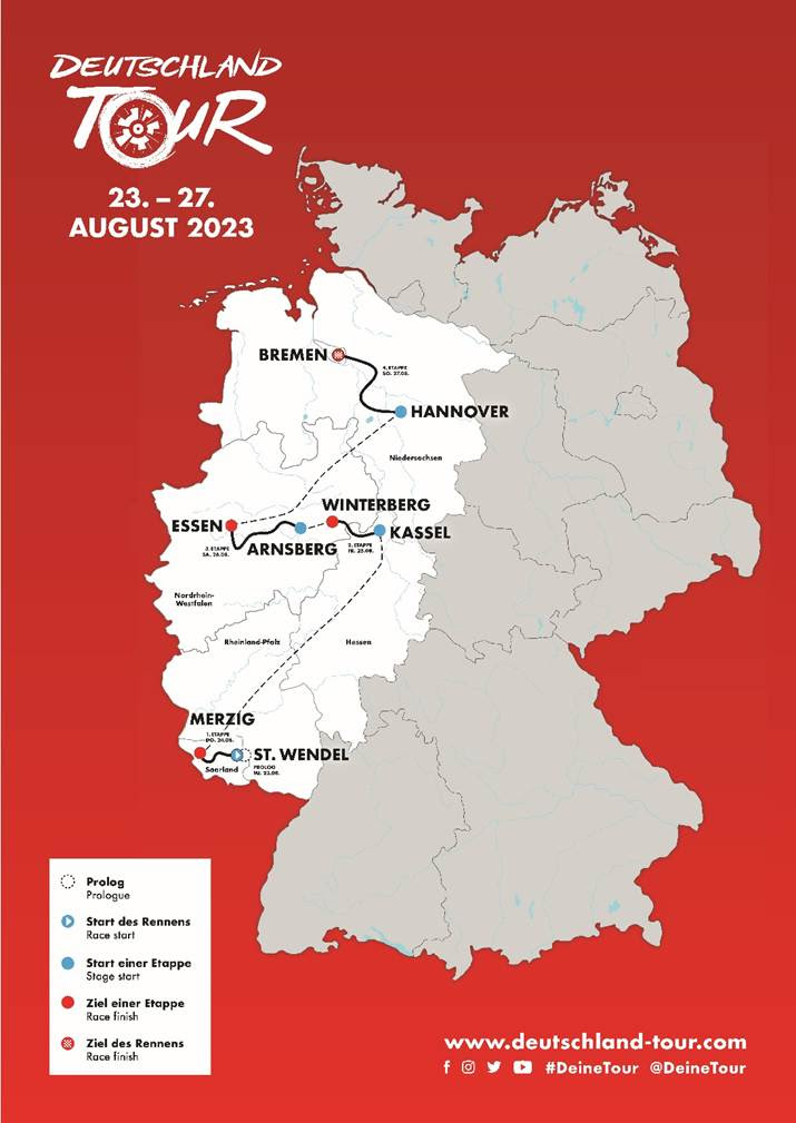 Un prólogo al principio, tres etapas clásicas y un sprint real al final: ese es el menú de los cinco días del Tour de Alemania 2023. La carrera de este año se disputa del 23 al 27 de agosto, del Sarre a Bremen. Especialmente los ciclistas con ganas de atacar y que prefieren un recorrido con garra están en la pugna por el título general.