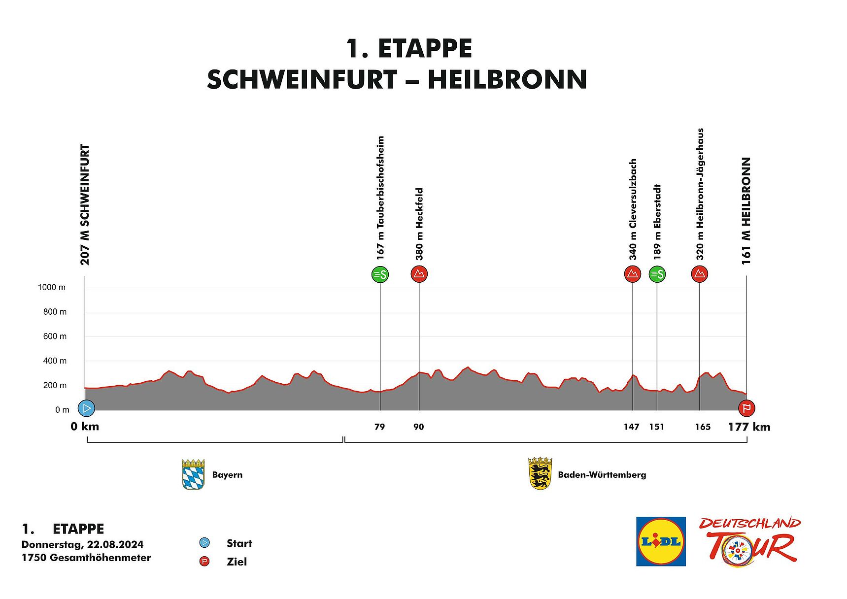 En la mañana del 22 de agosto, los equipos partirán del mercado de Schweinfurt para la 1ª etapa del Tour de Alemania 2024. Neutralizados, cruzan el Meno por el puente Maxbrücke y se dirigen hacia el sur hasta las afueras de la ciudad, donde tiene lugar la salida brusca. A los profesionales les espera una típica etapa clásica de camino a Heilbronn: 177 kilómetros con muchas subidas cortas. Después de 70 kilómetros, la ruta cruza la frontera bávara y continúa hacia el sur a través de Baden-Württemberg a través de Tauberbischofsheim. Después de que se haya llegado a la ciudad de Heilbronn, le espera un desafío poco antes del final. En la subida a la Jägerhaus, que merece la pena ver, los porcentajes de pendiente alcanzan los dos dígitos. A falta de 15 kilómetros para el final, esta es una oportunidad para las fugas que buscan recuperar sus segundas diferencias del día anterior