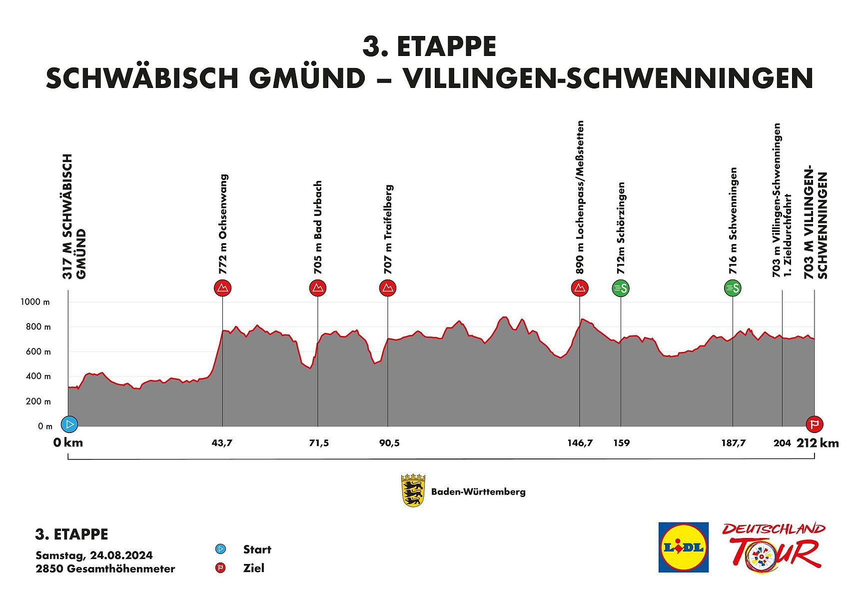 Con 212 kilómetros, es la etapa más larga y exigente que se ha disputado desde el regreso del Tour. Además, está el reto de casi 3.000 metros de altitud. Después de salir de Schwäbisch Gmünd, el día comienza con un tramo llano hasta Weilheim an der Teck. Un poco más tarde, nos espera la primera dificultad del día con la ascensión a Ochsenwang. A esto le siguen los típicos altibajos del Jura de Suabia. A través de Bad Urach y Lichtenstein-Unterhausen, la antigua ruta del tren de cremallera discurre paralela al Honauer Steige hasta el Traifelberg. Poco después de Albstadt, se alcanzará el punto más alto del Tour de Alemania 2024. En las alturas del Jura de Suabia se eleva a casi 900 m sobre el nivel del mar. continúe en dirección a Villingen-Schwenningen. Después de un bucle a través de Schwenningen, la única parte de la ciudad gemela, nos dirigimos al final de etapa en Villingen. Después de cruzar la línea de meta por primera vez frente a la Neue Tonhalle, habrá otra vuelta de meta, los últimos 8 kilómetros, que decidirán la victoria del día después de un día lleno de desafíos.