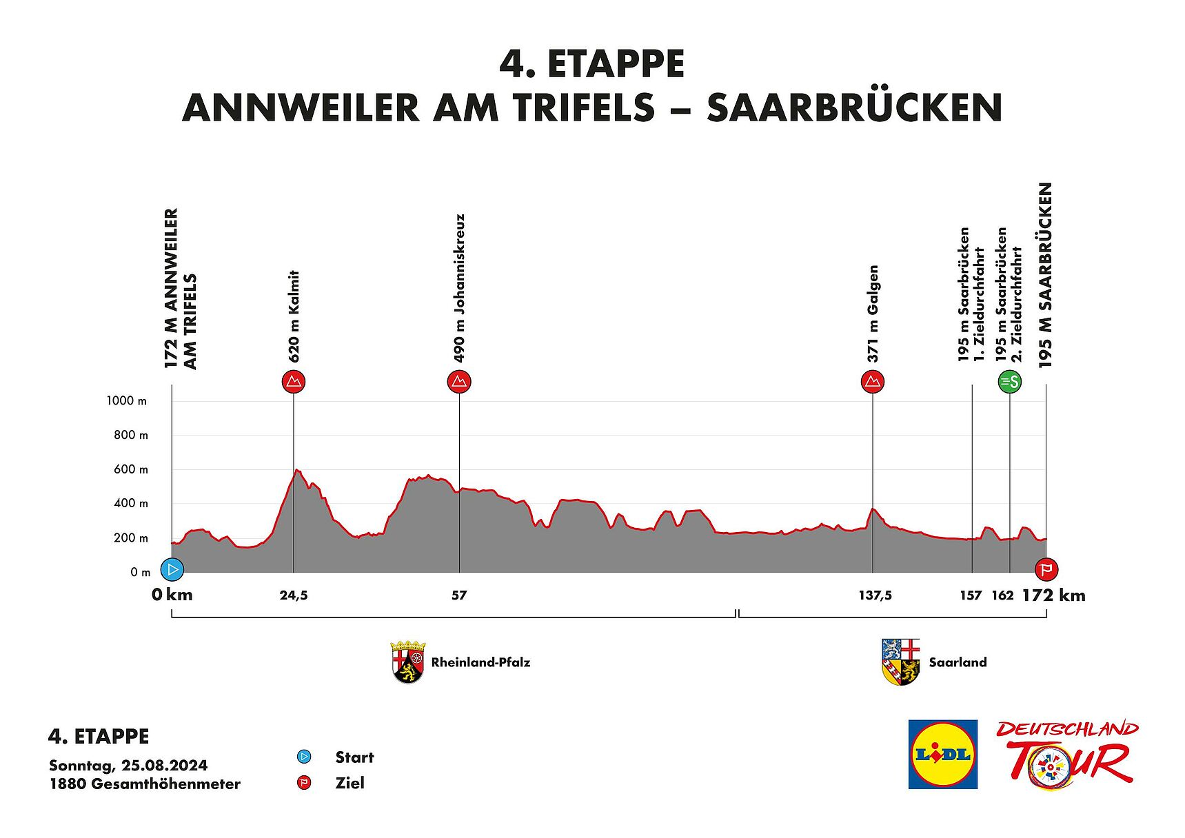 El final del Tour de Alemania 2024 comienza en Renania-Palatinado. El domingo por la mañana, el pelotón sale de Annweiler am Trifels en dirección noreste y recorre los lugares que merece la pena ver en la Ruta del Vino del Sur. Después de pasar Maikammer, sube directamente a la montaña más alta del bosque del Palatinado: el Kalmit está esperando y aún no se han completado 25 kilómetros en este día. Después del largo descenso, se vuelve a subir, esta vez hay que completar el Iggelbacher Stich hasta el Johanniskreuz. De camino al Sarre, el perfil se calma y se preparan para el gran final de la gira en Saarbrücken. Antes de que pueda animar en la línea de meta en la Heuduckstraße, se realiza una desafiante vuelta final dos veces. La corta subida en Metzer Straße es empinada y podría ofrecer la oportunidad de un ataque tardío a la victoria general del Tour de Alemania 2024, especialmente en la última vuelta.