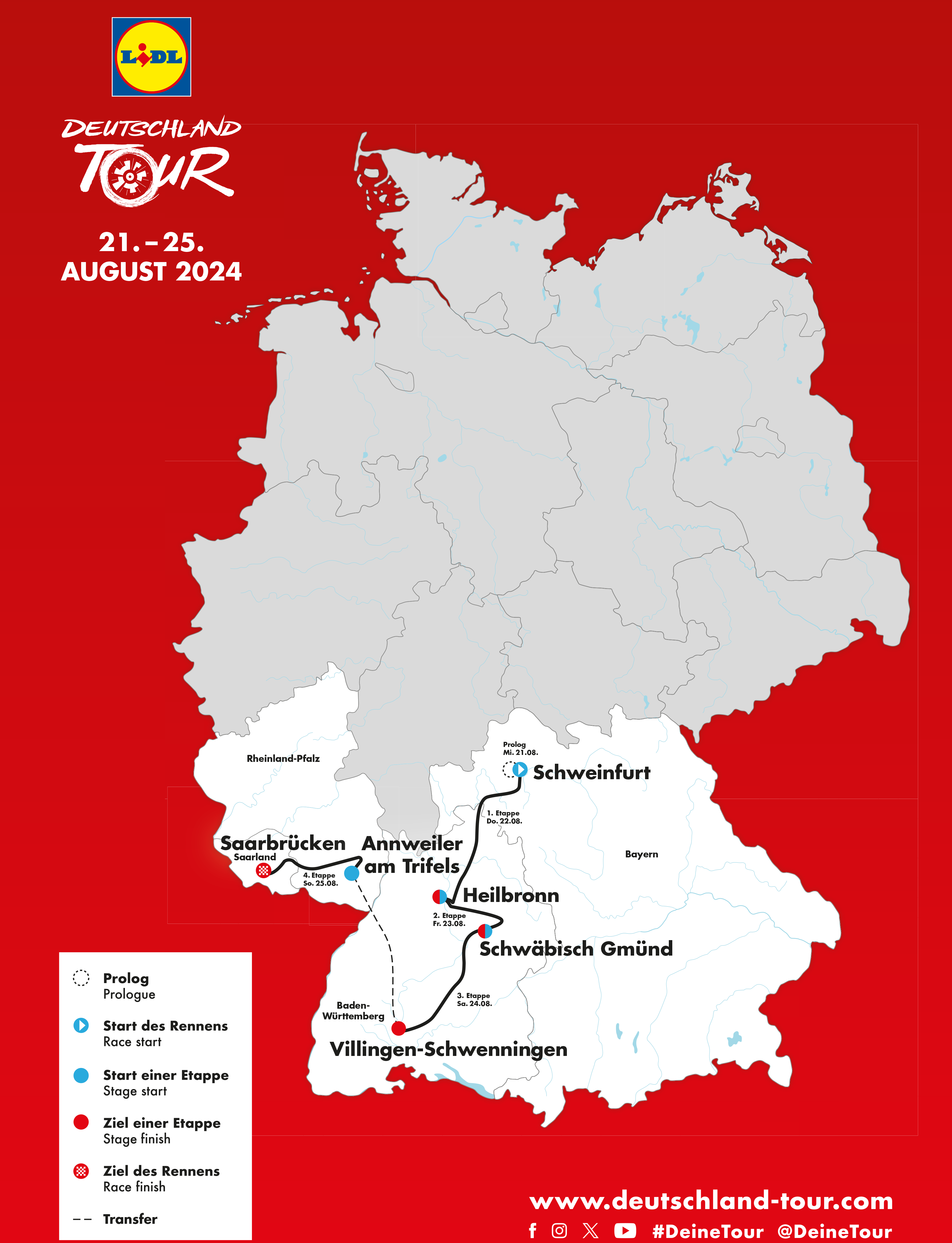 El Tour de Alemania en 2024 que se disputará desde el 21 de agosto hasta el día 25 ya promete pura emoción. Tras un comienzo corto pero intenso en Schweinfurt en un prólogo de 2,9 km, sólo unos segundos separarán a los mejores corredores. Las cuatro etapas siguientes ofrecerán muchas oportunidades para seguir mordiéndose las uñas y llegar a finales apretados con dos llegadas al esprint y dos de media montaña. El final de la prueba alemana estará situado en Saarbrücken.