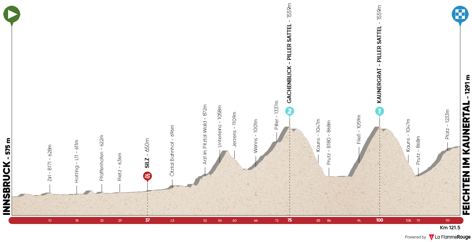 No fue la primera jornada una etapa larga, apenas 140 kilómetros, pero apenas presentaba, hasta el bucle que se debía realizar alrededor de la ciudad de meta, ningún kilómetro llano, algo que, unido a la presencia del Brennero (2ª categoría) y Axams (3ª categoría en su primer paso y no puntuable en el segundo), prometía un día inaugural divertido y nervioso del que Gianni Moscon (Ineos-Grenadiers) supo sacar el mayor provecho al imponerse en la línea de llegada y convertirse, así, en el primer líder de la carrera.