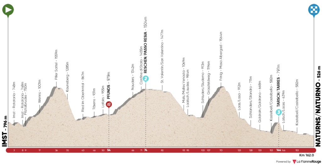 Como cabía esperar –será la tónica general de la carrera–, el pelotón demostró desde el inicio que no tenía intención de discutir con aquellos que desearan rodar destacados en los primeros kilómetros y eso propició que nada más pasar junto a la pancarta del kilómetro 0 Reuben Thompson (Groupama-FDJ), Reinardt Janse Van Rensburg (Qhubeka-Assos), Mathias Vacek (Gazprom-RusVelo), Davide Bais (Eolo-Kometa), Morten Hulgaard (Uno-X) y Felix Engelhardt (Tirol-KTM) no tuvieran demasiado problema en formar la que sería la fuga del día.