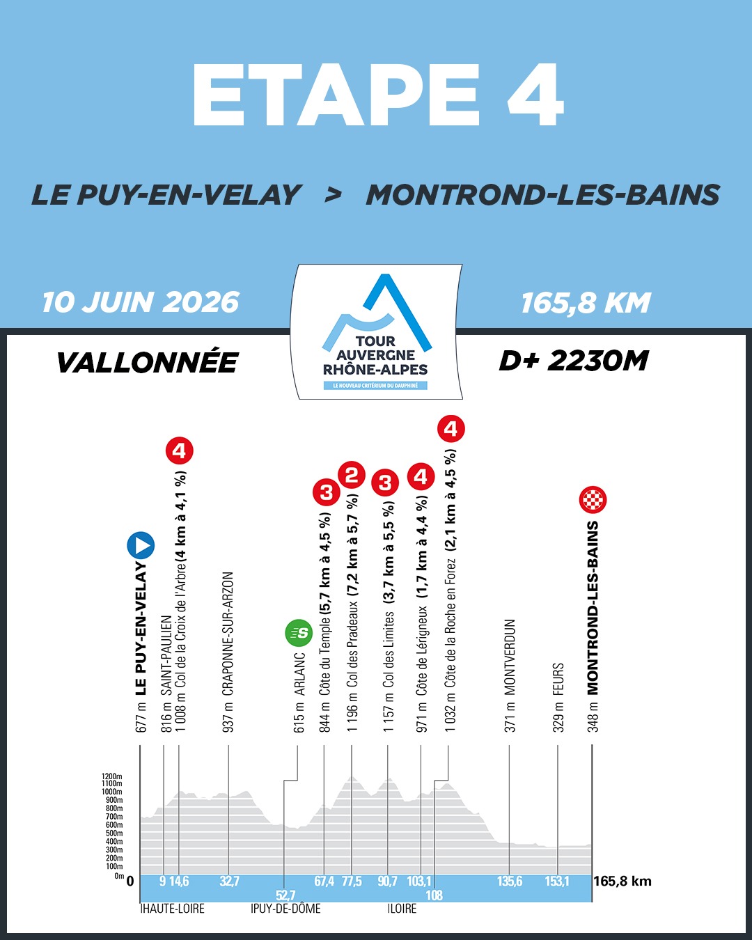 4ª: Miércoles 10 junio. Le Puy en Velay – Montrond-les-Bains (165,8 km)