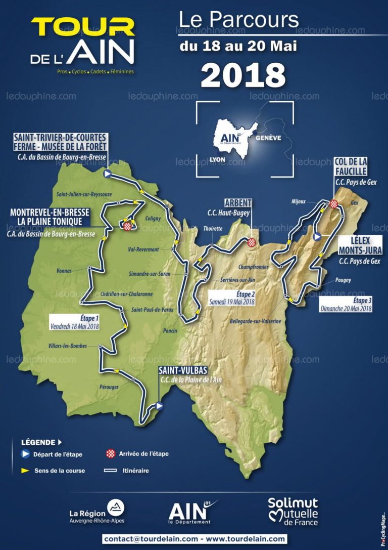 El Tour de l’Ain -que cambia de agosto a mayo (18 al 20)- ya tiene trazado 2018 sobre tres etapas en línea, una menos que en la pasada edición con victoria de Thibaut Pinot. La primera será para velocistas, la segunda de media montaña con siete cotas puntuables y todo se decidirá en la tercera y última en la meta situada en la cima del Col de la Faucille (1.323 metros de altitud), tras ascender 11,1 kilómetros a 6,5%. de media y tras solo 133,3 kilómetros de distancia.