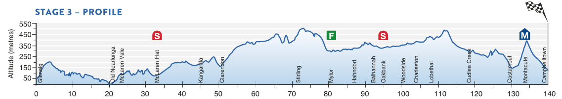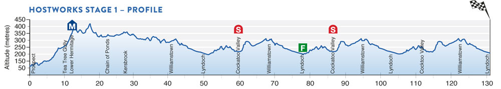 2ª: Miércoles 20. Unley – Stirling, 132 kms 3ª: Jueves 21. Glenelg – Campbelltown, 139 kms 4ª: Viernes 22. Norwood – Victor Harbor, 138 kms5ª: Sábado 23. McLaren Vale – Willunga Hill, 151.5 kms