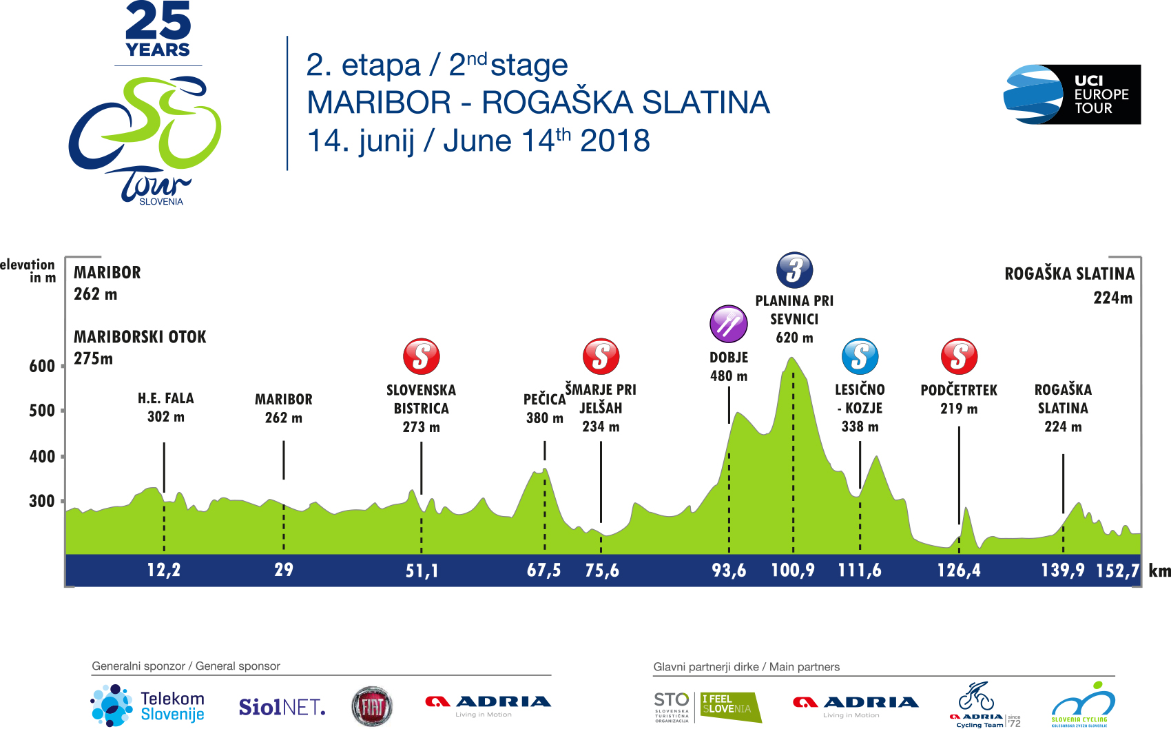 Nik Čemažar (Eslovenia), Benjamin Hill (Ljubljana Gusto Xaurum), Jon Božič (Adria Mobil), Juraj Bellan y Martin Haring (ambos del Dukla Banska Bystrica) fueron los escapados del día hasta 15 kilómetros del final con un paso previo por meta. Dos caídas consecutivas dejaron sin opciones a varios favoritos como McLay, Renshaw, Ewan, Groenewegen, Cavendish y Kittel, beneficiando las opciones de los que siguieron sin problemas.