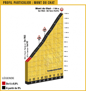Después superar esta pared, los corredores todavía tendrán que hacer frente, antes de descender hacia Chambéry, donde se situará la línea de meta, al Mont du Chat, un ascenso de 17 kilómetros con porcentajes que alcanzan una dureza máxima del 12%.