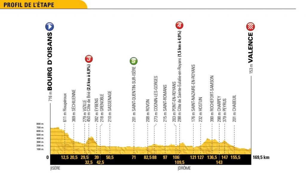 Terminados los Alpes, mañana día de recuperación, o de aventureros, entre Bourg d’Oissans y Valence, de 169,5 kms.