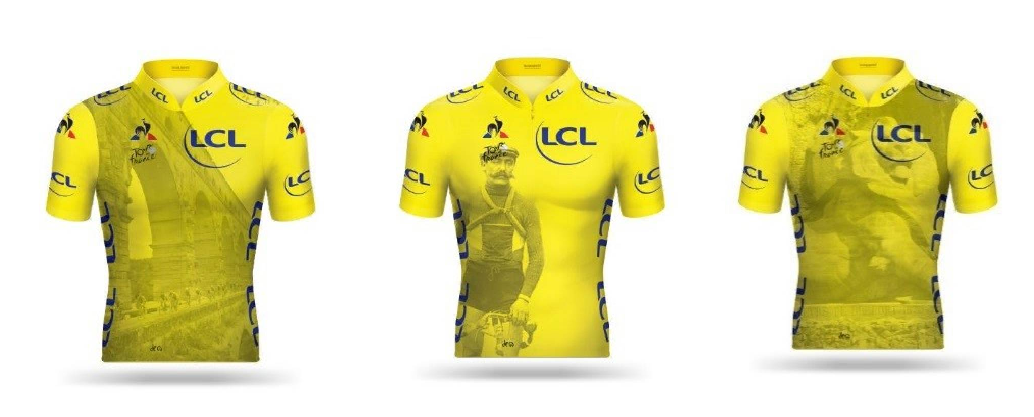 Para los 100 años del maillot amarillo, el líder de la general se verá recompensado cada tarde con un ejemplar único. La marca Le oq sportif y los organizadores del Tour de Francia, en presencia de LCL, presentaron en la fábrica de la marca francesa en Romilly-sur-Seine los veinte maillots que se disputarán los corredores en el mes de julio. Rendirán homenaje al Atomium de Bruselas, la catedral de Reims, el León de Belfort, la plaza del Capitole en Toulouse, así como a Eugène Christophe y a los pentacampeones del Tour.
