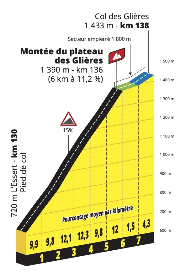 El segundo y último día de descanso anticipa el decisivo tríptico en los Alpes. La 16ª etapa encadena Saint-Nizier-du-Moucherotte (11.1km al 6.5%) y Villard-de-Lans (2.2km al 6.5%), aperitivo de la jornada reina, la 17ª, con una inédita vertiente de la Madeleine (17.1km al 8.4%) y la Loze (21.5km al 7.8%), techo del Tour a 2304 metros, y la 18ª no es menos con el conocido Cormet de Roselend (18.6km al 6.1%) y el temible Gliéres (6km al 11.2%) coronado por un tramo de sterrato.