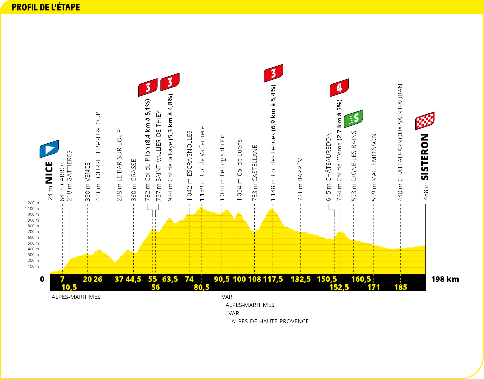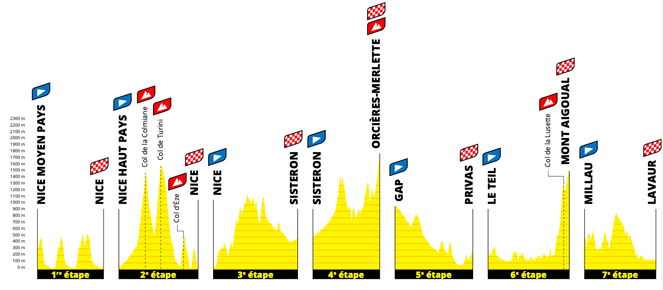 La capital de la Costa Azul acoge el Grand Départ y dos jornadas iniciales con picante. La 1ª etapa debería resolverse al sprint pese al doble paso por la cota de Remiez (5.8km al 5.1% de pendiente media), también protagonista en el recorrido de La Course. La 2ª visita los Alpes Marítimos en un recorrido típico de la París-Niza con las subidas de la Colmiane (16.3km al 6.3%), Turini (14.9 km al 7.4%), Èze (7.8 km al 6.1%) y Cuatro Caminos (5.5km al 5.7%). No es un día para ganar el Tour, pero alguno podría perderlo.