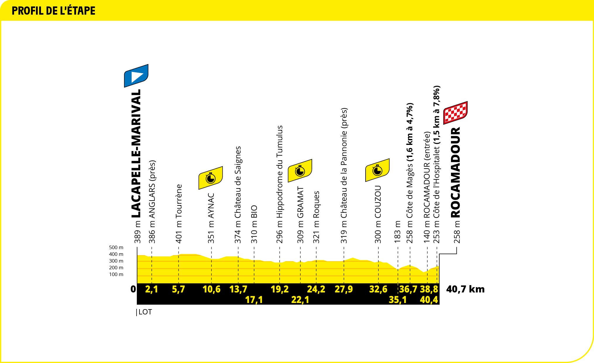 La penúltima etapa, el sábado 23 de julio, será una contrarreloj individual de 30 km con salida en Lacapelle-Marival y llegada a Rocamadour, pasando cerca de la sima de Padirac, uno de los lugares turísticos más visitados de Occitania, así como del santuario de Rocamadour. La ciudad medieval había impresionado al director del Tour, Christian Prudhomme, durante la Ruta de Occitania de 2020, donde ganó Benoît Cosnefroy.