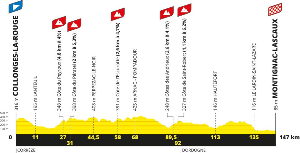 Las velocistas toman nota: esta etapa es un poco accidentada pero bastante ondulada. Permitirá apreciar los castillos de Pompadour y Hautefort y SaintRobert, uno de los pueblos más bellos de Francia, así como el impresionante valle del Vézère. Si se trata de una llegada en pelotón, los corredores más rápidos dispondrán de una recta de 650 metros en la que podrán demostrar su ritmo, a un paso del famoso yacimiento prehistórico.