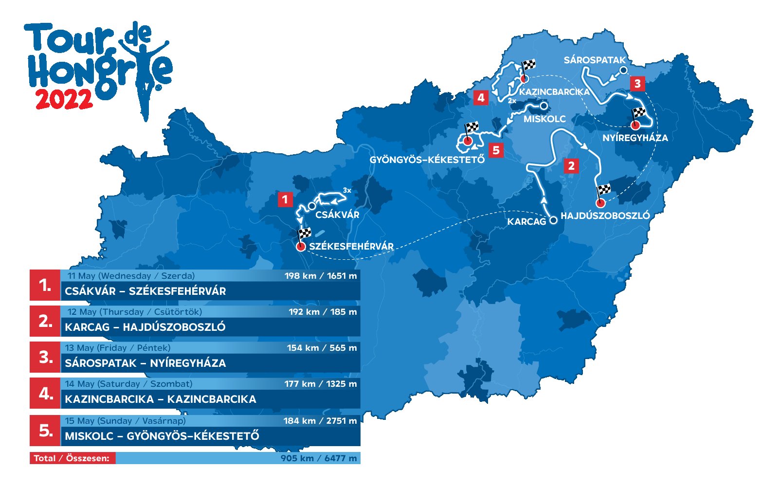 El pelotón internacional del 43º Tour de Hongrie saldrá de Csákvár el 11 de mayo y recorrerá 905 kilómetros en cinco días hasta la meta final en Kékestető. El Tour de este año es más de 100 kilómetros más largo que el de hace un año, pero el campo será mucho más fuerte con doce equipos del WorldTeam. El programa también ha revelado que el mejor velocista del año pasado en la Vuelta a España, el legendario Stephen Roche, estará presente para ver a los húngaros en acción.