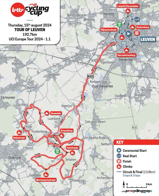Ya se ha dado a conocer el recorrido del Tour de Lovaina 2024, una carrera que se celebrará el próximo 15 de agosto en un circuito lleno de colinos entre las que destacan muros como los de Smeysberg, Mommaertsstraat, Holstheide, Bekestraat o Veeweide. Al final de los 193 kilómetros, los corredores habrán tenido que afrontar un total de 38 subidas que harán que la carrera sea bastante selectiva y adecuada para corredores expertos en este tipo de pruebas.