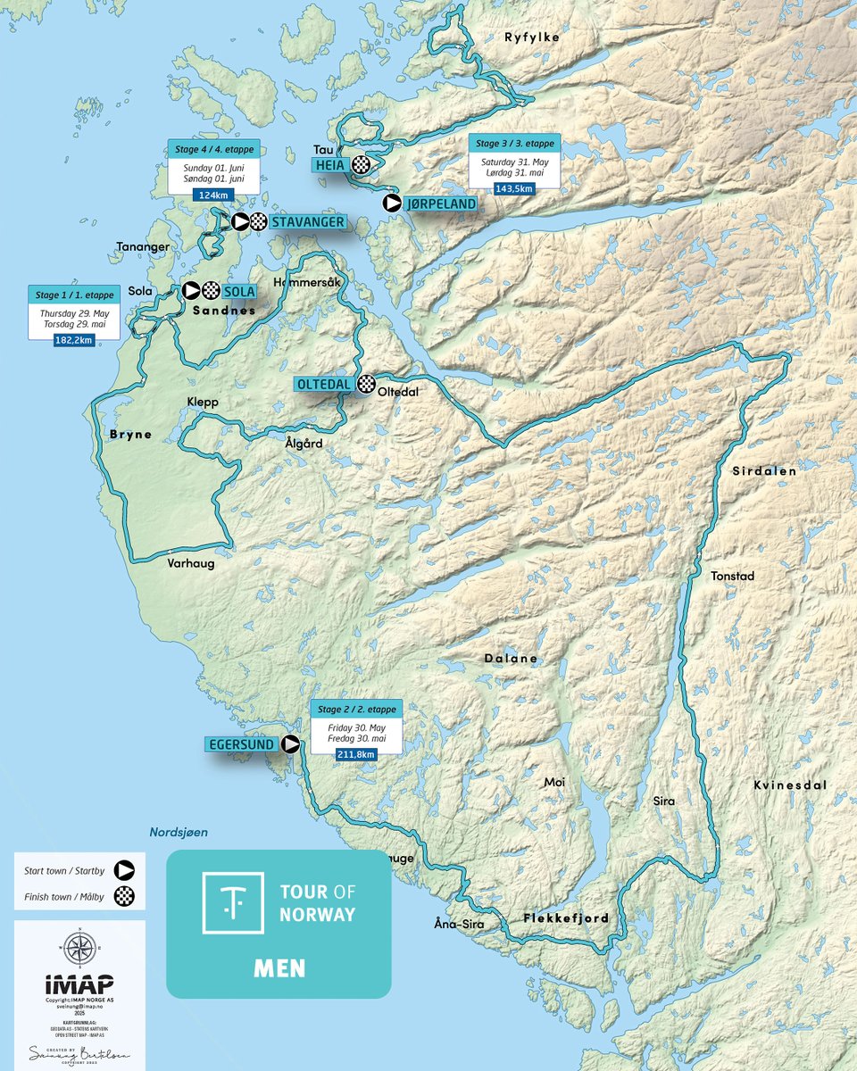 La 14ª edición del Tour de Noruega (1.Pro) se disputará entre el 29 de mayo y el 1 de junio de 2025. La carrera tendrá un recorrido de cuatro etapas. Comenzará en Sola, con la llegada más apta para los velocistas y continuará con una jornada maratoniana de 211 kilómetros entre Egersund y Oltedal. El sábado tendrá lugar la etapa reina de montaña, con final en alto en Heia y el domingo concluirá la carrera con un circuito en torno a Stavanger. Aún no se ha confirmado la lista de equipos participantes. El vigente campeón de la prueba es el francés Axel Laurance.