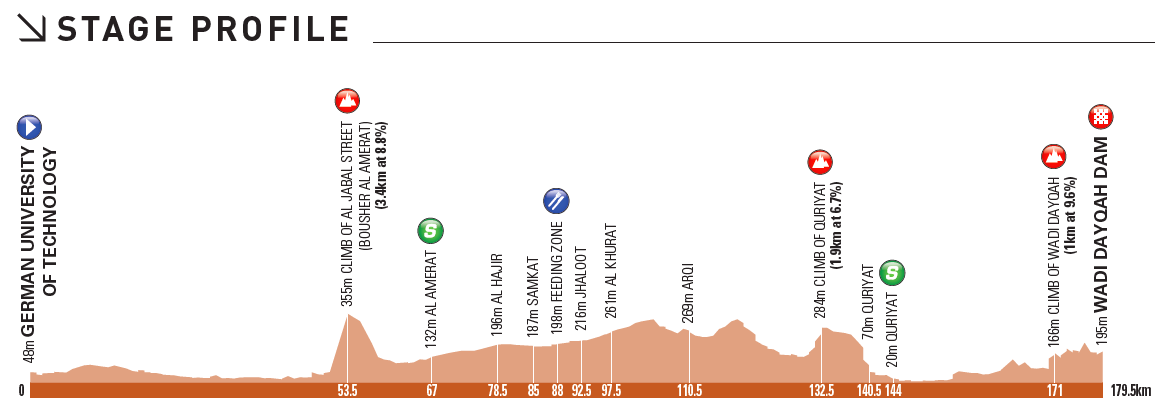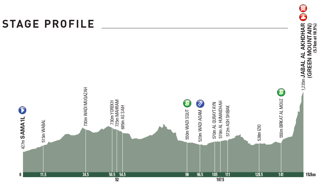 La etapa reina de esta edición de la carrera espera el sábado, 17 de febrero. Serán 152 kilómetros entre Sama’il y Jabal Al Akhdhar [conocida entre los aficionados como Green Mountain o Montaña Verde], la gran cima del Tour de Omán con sus 5,7 kilómetros con una pendiente media del 10,5%.