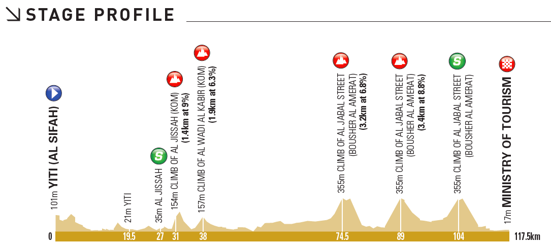 Con sólo 117 kilómetros, la cuarta jornada será la más corta de esta edición del Tour de Omán, pero su corta propuesta no debe hacernos caer en la tentación de pensar que será sencilla. El recorrido entre Yiti y el Ministerio de Turismo pondrá a prueba la velocidad y la resistencia de los corredores en la triple subida hasta la calle Al-Jabal (3,4 km al 8,8%) antes de la llegada.