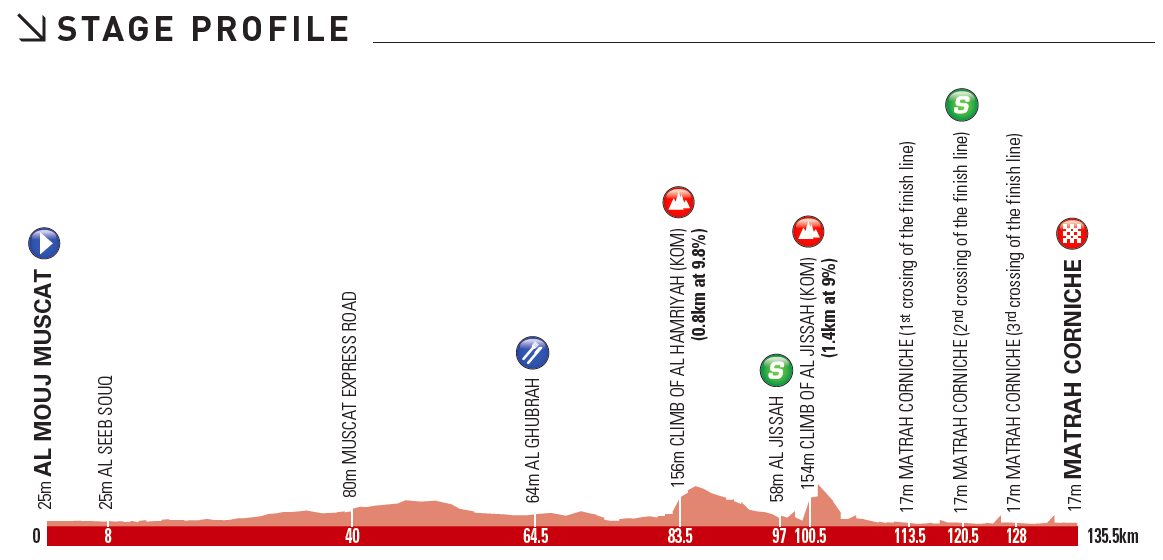La sexta y última etapa unirá la Mezquita de Al Mouj con Matrah Corniche en 135 kilómetros que deberán depararnos el último sprint de la carrera.