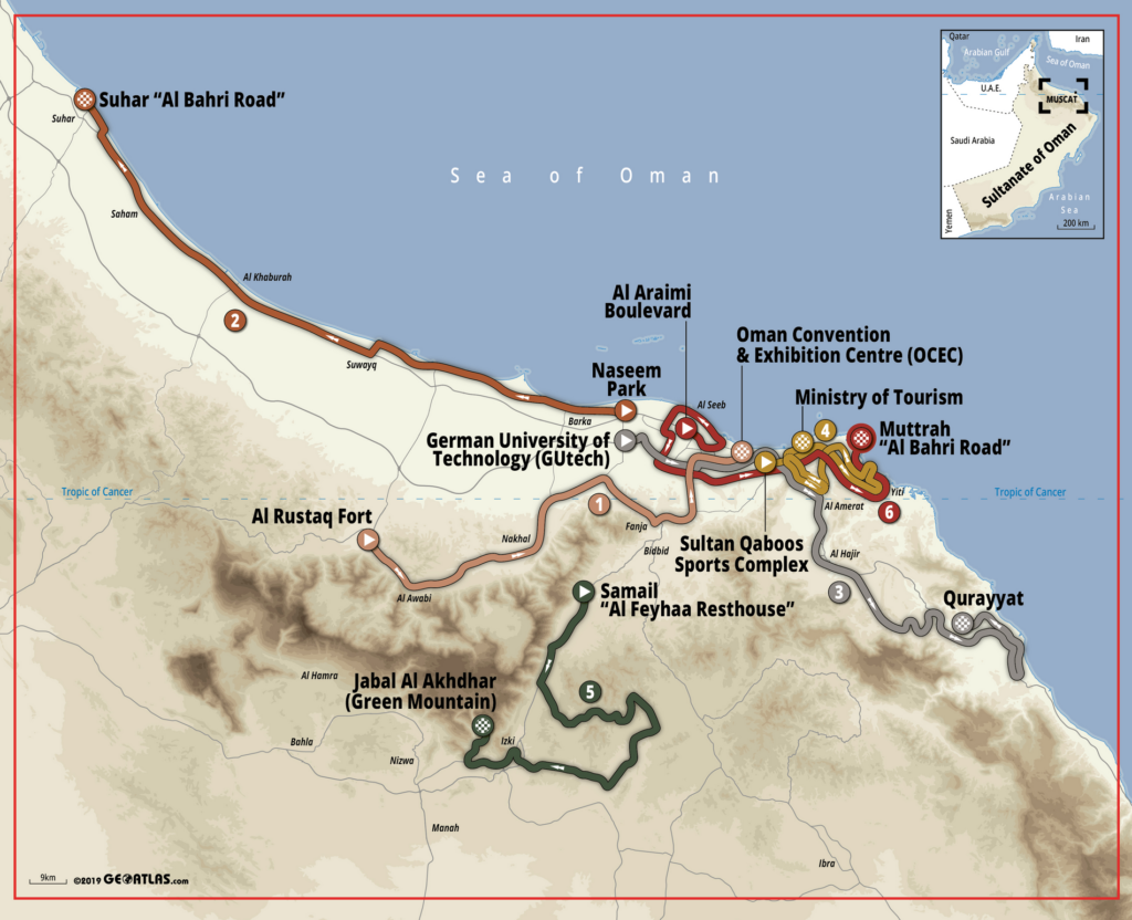 La primera etapa comenzará desde el interior, en Rustaq, cuyo emblemático castillo data del siglo XII. El final en Muscat se encuentra frente a un símbolo de la modernidad, el Centro de Convenciones y Exposiciones de Omán, con una meta que siempre inspira a los atacantes. El escenario cambiará dramáticamente con 170 km a lo largo de la costa en la 2ª etapa, hasta llegar a Suhar, donde los velocistas tienen una gran posibilidad de luchar por la victoria.