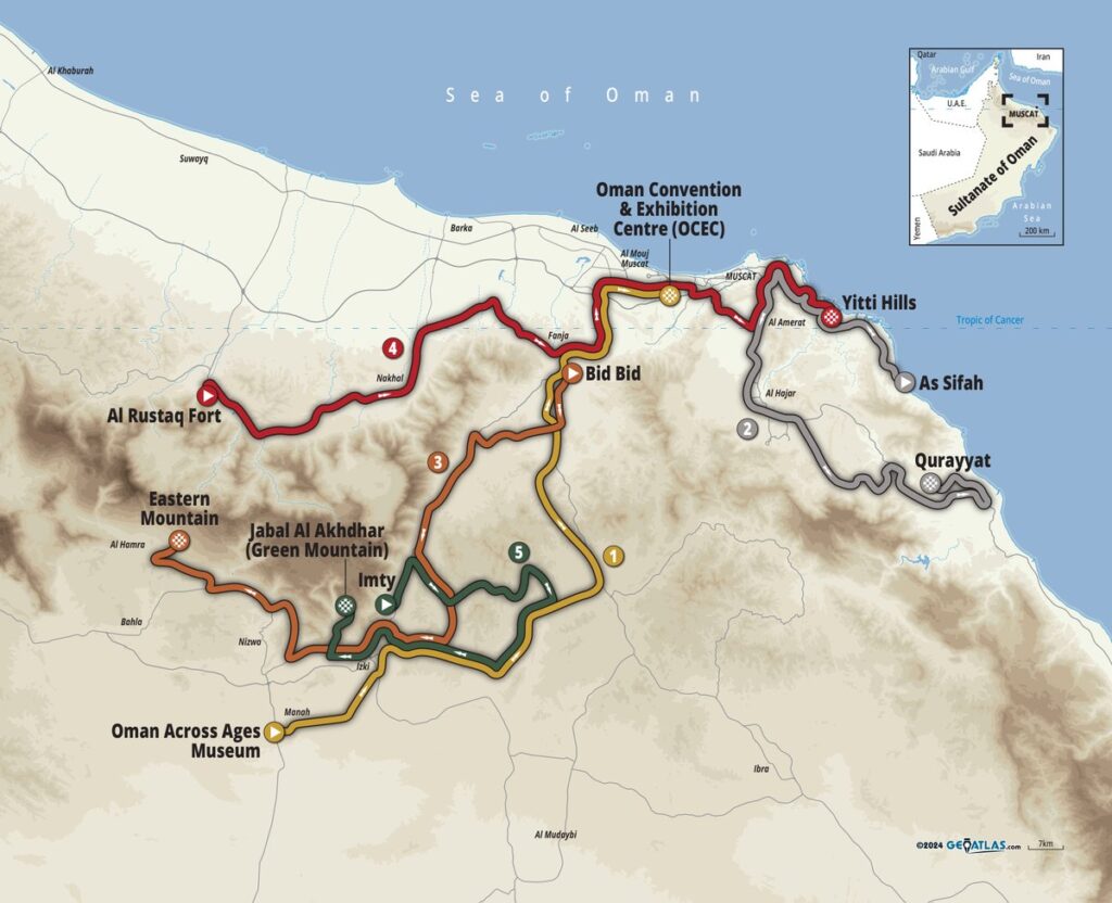 La 13ª edición del Tour de Omán, prevista del 10 al 14 de febrero de 2024, ofrecerá un menú de cinco jornadas para todos los gustos, desde velocistas y rematadores hasta escaladores. Sus dos ascensiones icónicas, Eastern Mountain (etapa 3) y Green Mountain (etapa 5), estarán presentes siendo un hueso duro de roer a estas alturas de principio de la temporada.