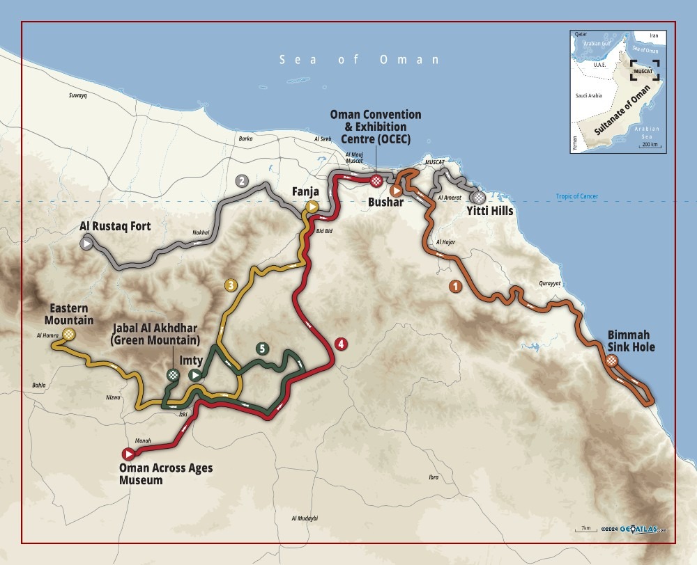 El pelotón, y especialmente los velocistas, volverán entonces a un terreno mayoritariamente llano entre el Museo Oman Across Ages y el Centro de Convenciones y Exposiciones de Omán (etapa 4). En 2024, Caleb Ewan fue el más rápido en esta ruta, con una recta final de 700 metros ligeramente cuesta arriba.