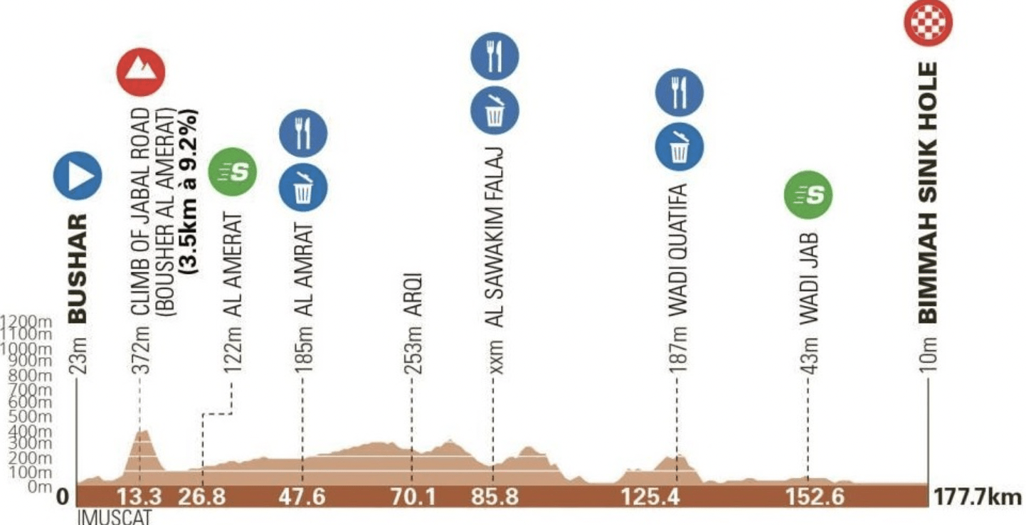 Se espera una primera batalla entre puncheurs al día siguiente, en las alturas que rodean Mascate. Tras una salida desde el fuerte de Al Rustaq, el final promete ser explosivo, con la subida de Qantab (2,6 km al 6,5%), que se cruza a falta de 10 km, y la ascensión de Yitti Hills (1,6 km al 7%), cuya cima se encuentra a 800 m de la línea de meta.