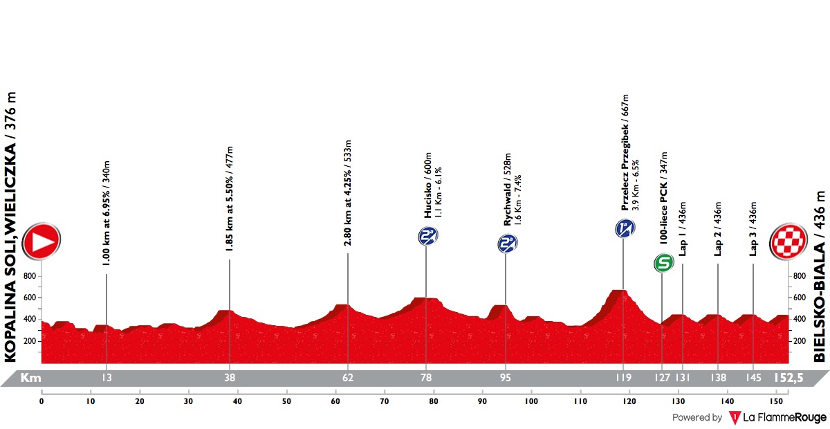 Michal Kwiatkowski (Team Sky) se hizo con la victoria en el muro de Szczyrk con un claro sabor ardenero con rampas de hasta el 15% que el campeón polaco administró magistralmente para batir en primer término el intento de Richard Carapaz (Movistar Team) desde la base y posteriormente el contraataque de Dylan Teuns (BMC) en los últimos 100 metros de la llegada. Con esta victoria Kwiatkowski se enfunda el maillot de líder y hace tangible su candidatura como máximo favorito.