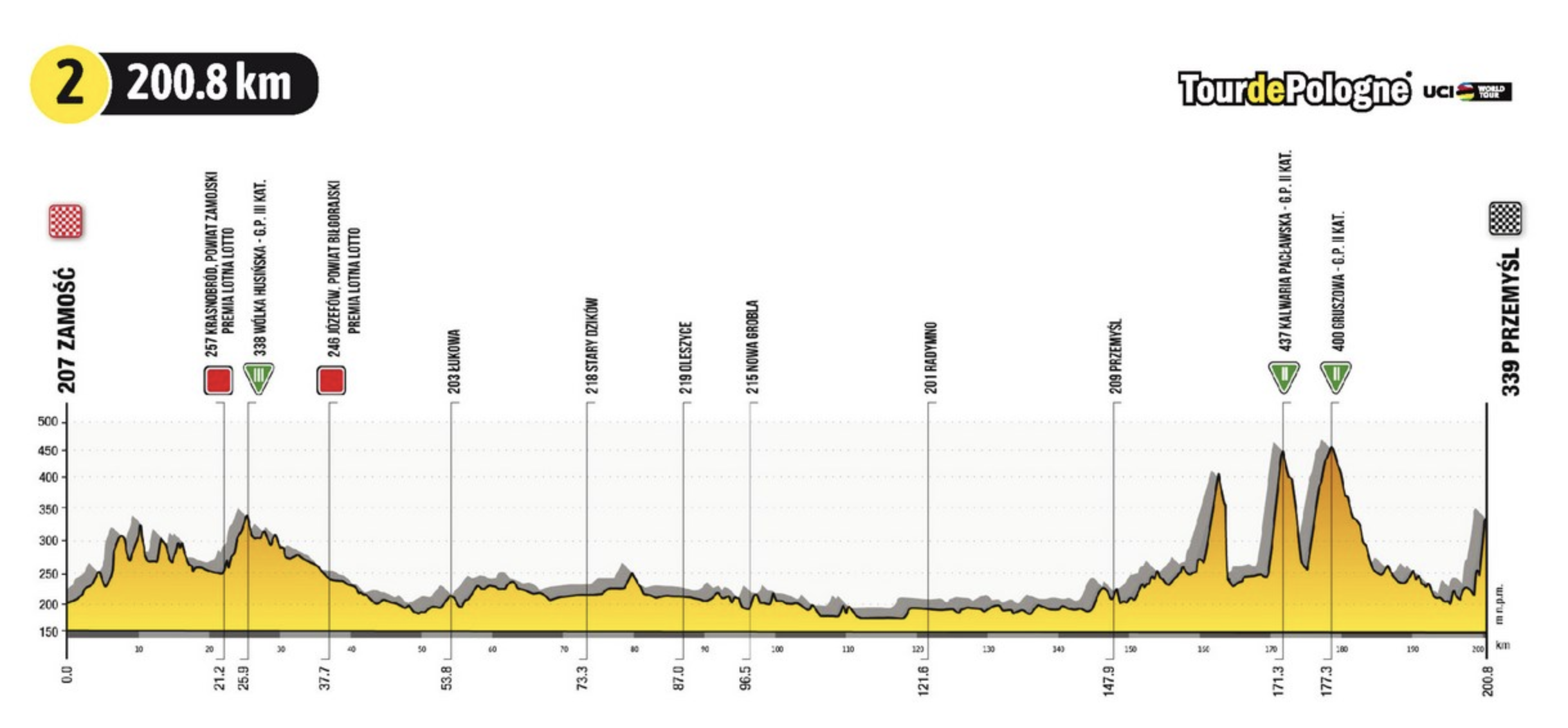 La segunda etapa tendrá salida desde Zamość, una perla del Renacimiento polaco, y la llegada en Przemyśl, una de las ciudades más antiguas y bellas de Polonia. La ruta pasa, entre otros, por Kalwaria Pacławska, donde se concentrarán las dificultades montañosas. La propia meta está situada en un tramo ascendente, cuya pendiente alcanza el 13-15 por ciento.