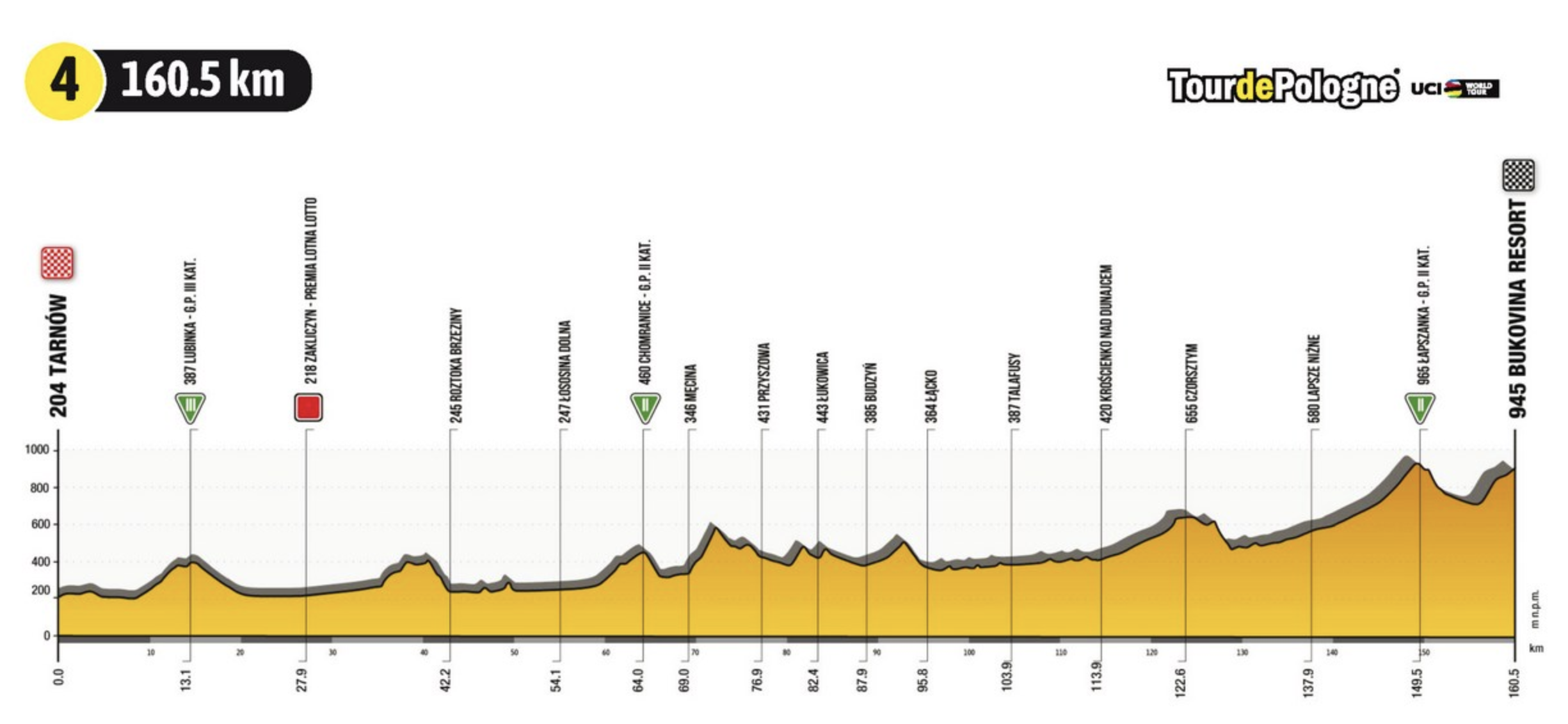 La salida de la cuarta etapa será en Tarnów. La pintoresca ruta se desarrolla a lo largo del río Dunajec. El pelotón pasará por Krościenko, Łapszanka y llegará a la meta en el conocido tramo ascendente de Bukowina Tatrzańska, junto al complejo turístico de Bukovina.