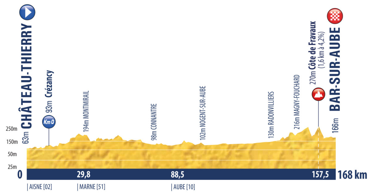 14/8. Etapa 1 (llana): Château-Thierry (Aisne) – Bar-sur-Aube (Aube) 168 km