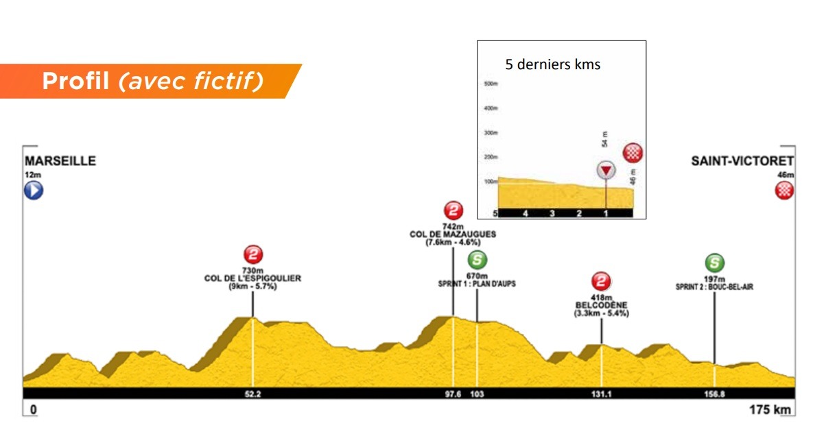 La primera etapa comenzará en Marsella y terminará en Saint Victoret, tras 175 kilómetros y más de 2.600 metros de desnivel. El recorrido incluye tres puertos, concentrados en la parte central de la jornada, y un final que promete ser rápido.