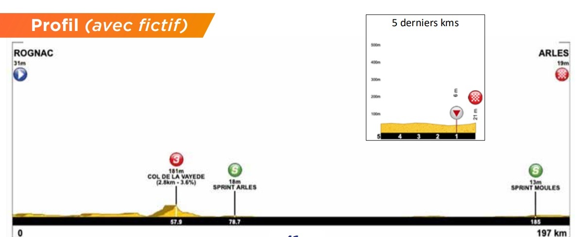La etapa final será similar a la de 2024. Irá de Rognac a Arles por una carretera principalmente llana. Por tanto, el final al sprint es el más probable.
