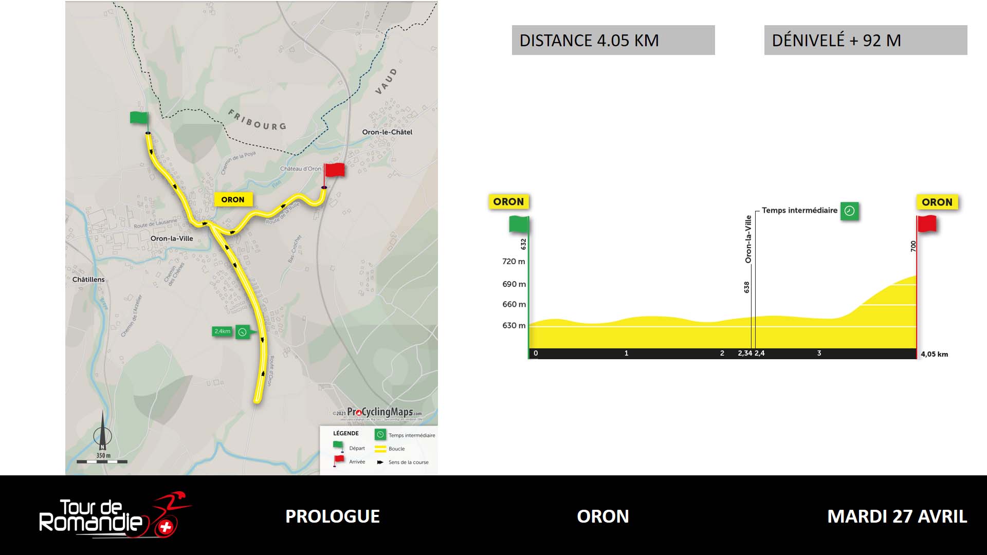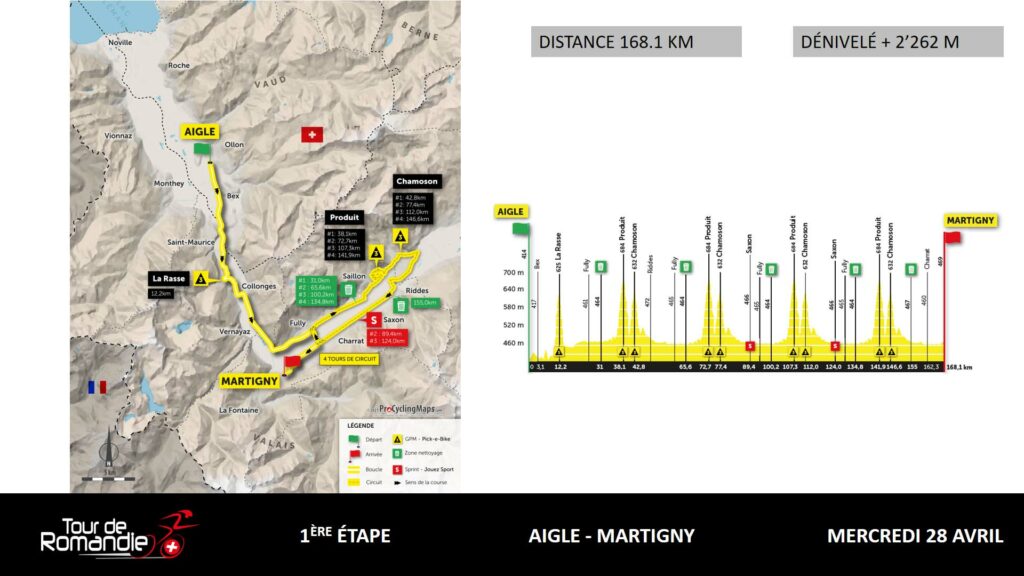 El Tour de Romandía arrancará el martes 27 de abril con un prólogo de 4 kilómetros calcado al de la última edición, aunque con salida y llegada en la localidad de Oron. Un día después será el turno para la jornada no mundialista entre Aigle y Martigny, de 169 kms con el bucle final que incluye la subida al Col de la Petit Forclaz, de 4 kilómetros al 10.2% de pendiente media y con rampas que alcanzan el 15%.
