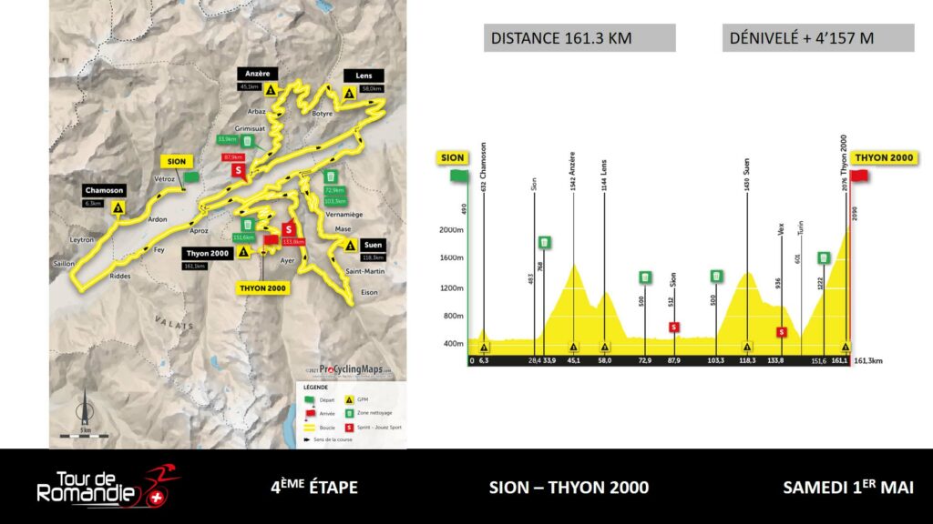 La montaña será la protagonista de la cuarta etapa, que se disputará entre Sion y Thyon 2000 con un duro final en alto tras 162 kilómetos con varios puertos de categoría. Y, para terminar, un día más tarde, se disputará una contrarreloj individual de poco más de 16 kilómetros con salida y llegada en Friburgo.