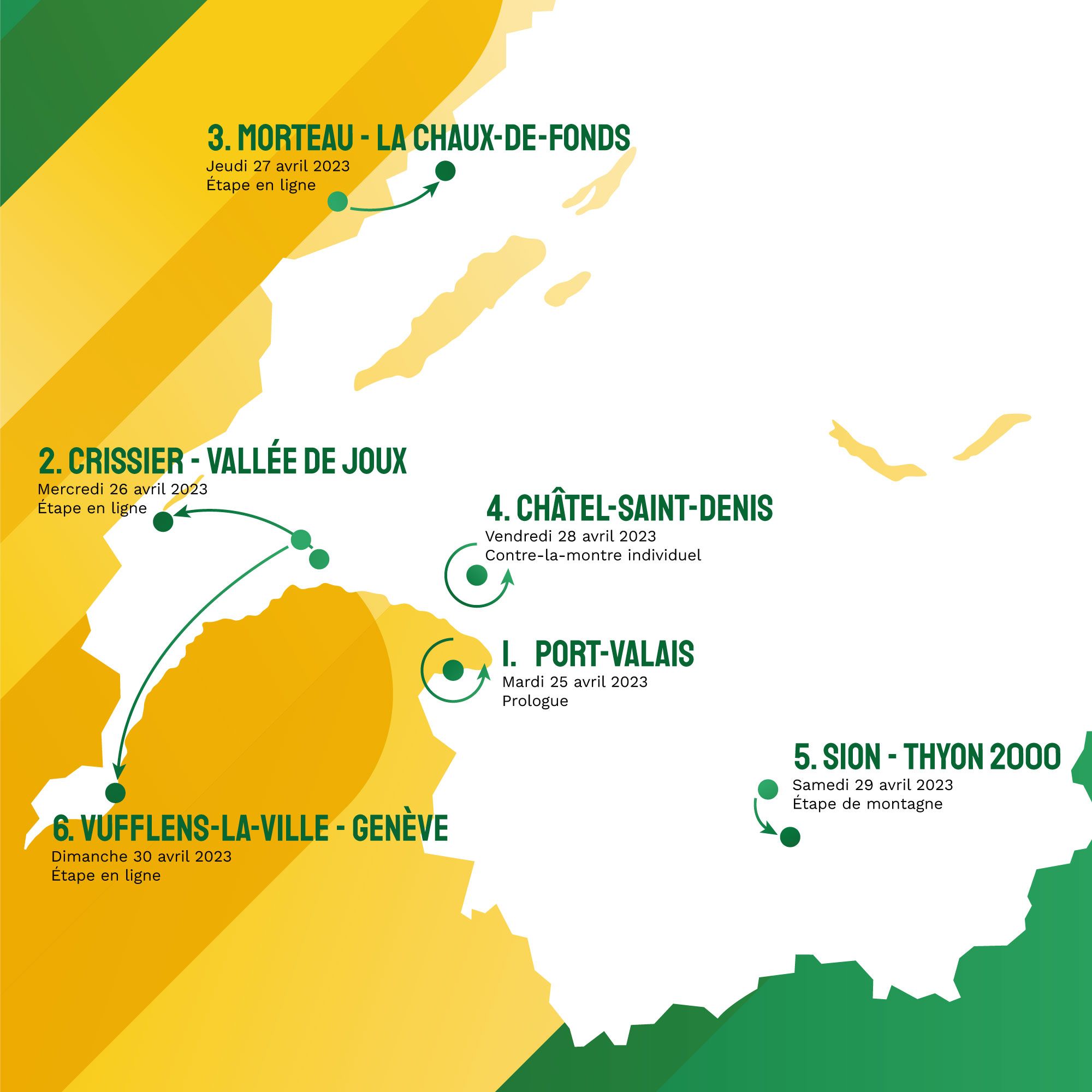 Prólogo, etapas con colinas, etapas de montaña con la primera subida de 2.000 metros de la temporada, contrarreloj y sprint. La carrera hará también incursiones en Francia, como ejemplifica la jornada que arrancará desde Morteau. La carrera comenzará en Port-Valais, con un prólogo, y terminará en Ginebra con una etapa para velocistas. La general quedará determinada por la contrarreloj de Chatel-St-Denis y la jornada reina con final en Thyon 2000.