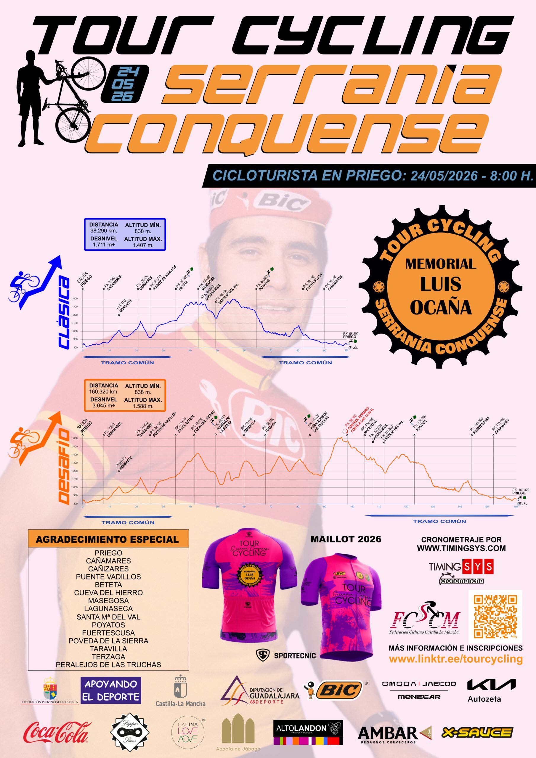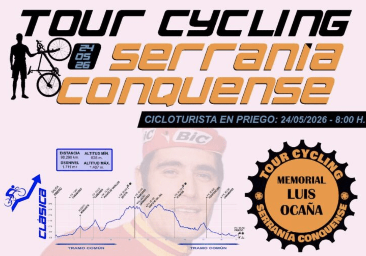 El Tour Cycling Serranía Conquense-Memorial Luis Ocaña, programado para los próximos 23 y 24 de mayo de de 2026 en la hermosa localidad conquense de Priego, no sólo rinde homenaje a una figura legendaria del ciclismo español, sino que también actúa como un motor de revitalización y promoción del territorio rural que vio nacer y crecer al campeón Luis Ocaña. A su paso por las majestuosas tierras de la Alcarria Conquense, la Serranía Conquense y el Alto Tajo, esta prueba se convierte en un viaje que une deporte, historia y naturaleza, impulsando la vida y la economía de sus pueblos.