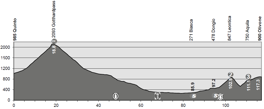 3ª: Lunes 15 junio (15:10). Quinto – Olivone, 117.3 kms