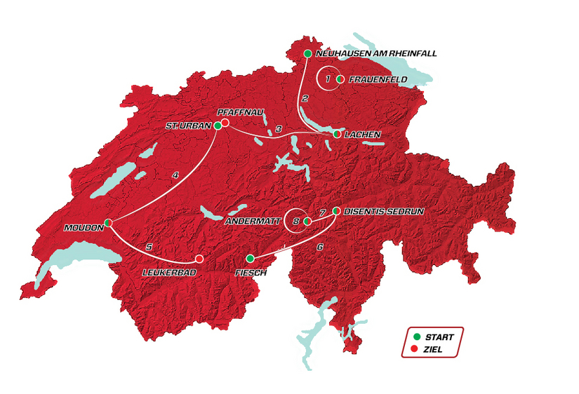 Los corredores de los 23 equipos -19 de primera división y 4 invitados- comenzarán el domingo 7 de junio en Frauenfeld. La carrera seguirá en sentido contrario a las agujas del reloj hacia la región del lago de Zúrich, a través de la meseta central hacia Vaud, Valais y la coronación final en el corazón de los Alpes.